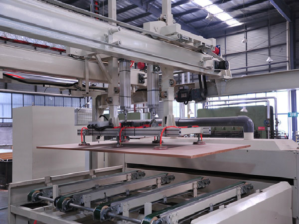 標準型壓機自動生產線特點是節省人工,對技術工人依賴少。并且線體自動化程度高,保證每天的產量。生產線帶有進板除塵裝置,密度板表面的灰塵除去后在壓貼可以打打提高產品的質量。出板采用吸盤自動吸出,防止了以前人工出板帶來的危險以及對板材表面的二次損傷,有效的保護表面免于劃傷。采用自動刮邊并且刮下的紙屑可以收集起來集中處理。成品板的檢驗采用吸盤移栽機,更加方便。自動堆垛省去的很多人工并且堆垛的更加整齊。