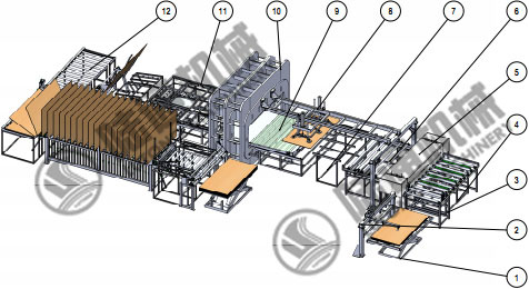 ①液壓升降臺 ②勾板機構(gòu) ③除塵裝置 ④定位輥臺 ⑤存紙架 ⑥吸盤上板機構(gòu) ⑦進板小車 ⑧貼面熱壓機 ⑨出板小車 ⑩自動刮邊機 ⑾自動檢板堆板機構(gòu) ⑿液壓升降臺