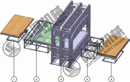 ①液壓升降臺 ②進板小車 ③貼面熱壓機 ④人工刮邊臺 ⑤液壓升降臺