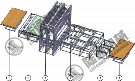 ①液壓升降臺 ②進板小車 ③貼面熱壓機 ④吸盤出版機構(gòu) ⑤人工刮邊臺 ⑥液壓升降臺