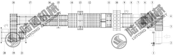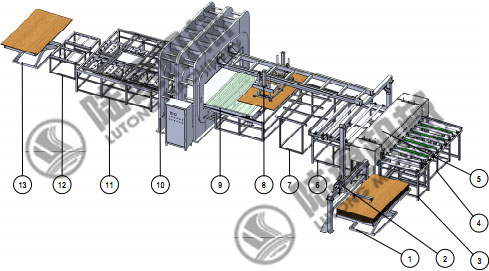 ①液壓升降臺 ②勾板機構(gòu) ③除塵裝置 ④定位輥臺 ⑤存紙架 ⑥吸盤上板機構(gòu) ⑦進板小車 ⑧貼面熱壓機 ⑨出板小車 ⑩自動刮邊機 ⑾定位輥臺 ⑿涼板線 ⒀自動檢板堆板機構(gòu) ⒁液壓升降臺