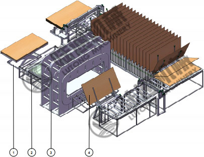 ①液壓升降臺 ②進板小車 ③貼面熱壓機 ④涼板線